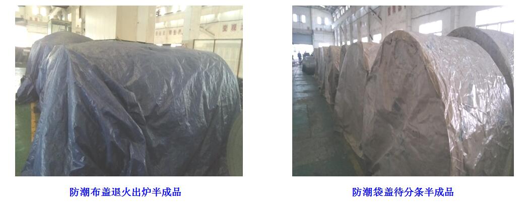 2、做好半成品、成品的防锈工作。在实际生产过程中,作为车间生产管理人员要根据生产进度密切关注气候变化情况,提早对半成品、成品做好防锈预防工作安排;使用防潮袋套盖、防潮布大面积铺盖、包装膜缠绕包装等方式将半成品、成品与空气隔绝,防止空气中的水分与带钢接触,产生结露而导致带钢生锈;有条件的区域还可搭棚、撒生石灰等方式进行带钢防锈工作。