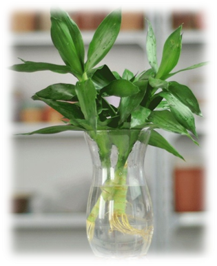 在初次插入时要去掉基部的叶片,以免影响竹子生长,另外需在根部用剪刀或刀子倾斜减去一小部分,这样可以更好的让竹子吸收水分,切处要尽量平滑。水达到花瓶三分之一处即可,不要多于三分之二。在生根前,每3天换水一次,生根后不要再进行换水,直接往花瓶里加水即可。天气干燥闷热时,需在叶面上喷水。最好使用井水或纯净水,如果使用自来水,最好储存一天后再用。水插富贵竹一般都放置在室内,虽然对阳光要求不高,但如果完全接触不到日照,同样会使叶子枯黄,生长不良。所以应尽量置于明亮通风环境,使其充分接触光照。对于水养的植株,我们一般都忽略施肥,其实不然,施肥可以让植株生长的更好,水插富贵竹每月施肥一次即可,可去花卉市场选择专业肥料,或在加水时滴上几滴溶解的维生素C1即可。