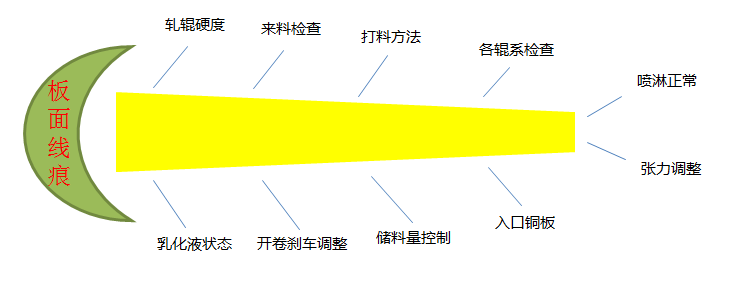 五连轧板面线痕问题一直存在也很难解决,客户经常投诉,问题非常严重,解决问题就要有一定的方法,刚好公司安排的培训里面我们学习过鱼骨图分析法,把问题分析出来逐个击破。