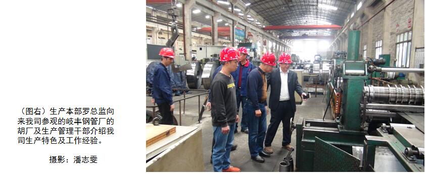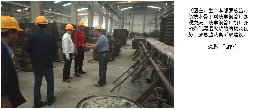 提起“黑带”,大家应该都不陌生,联钢建厂以来的拳头产品,主要应用于风扇铁芯、扇叶、机壳以及五金配件等产品,月产量达3000吨以上;随着环保要求越来越严格,联钢以保护环境为出发点,于2012年底将燃煤黑退火炉全部拆除,转为光亮退火炉生产和外加工两种生产模式。因为光亮退火炉的局限性,我们将一部分的订单也转为了光带;经过几年的发展,黑带的市场需求仍然见好,而且对于电机行业来说,黑退火的性能要优于光亮退火,因此公司决定在今年年底恢复黑退火炉,不同之处是将燃料由烧煤改为烧天燃气;在生产本部罗总监的带领下,公司生产部、设备部等主要技术骨干到岐丰钢管厂进行参观、交流。